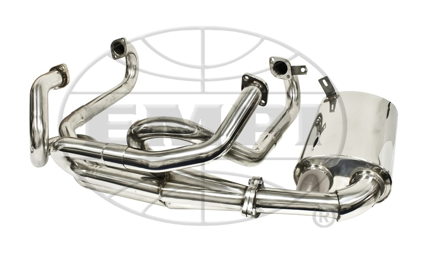 Stainless Steel Merged Exhaust System With Sideflow Muffler For Air-cooled Vw Bug & Ghia. A True Merged Exhaust Tig Welded For Strength And Good Looks. Empi’s 1-5/8″ Diameter Mandrel Bent Tubes Are Cut And Fitted Into A Long Merged Collector For Smooth Flow A True High Flow Performance Exhaust System.