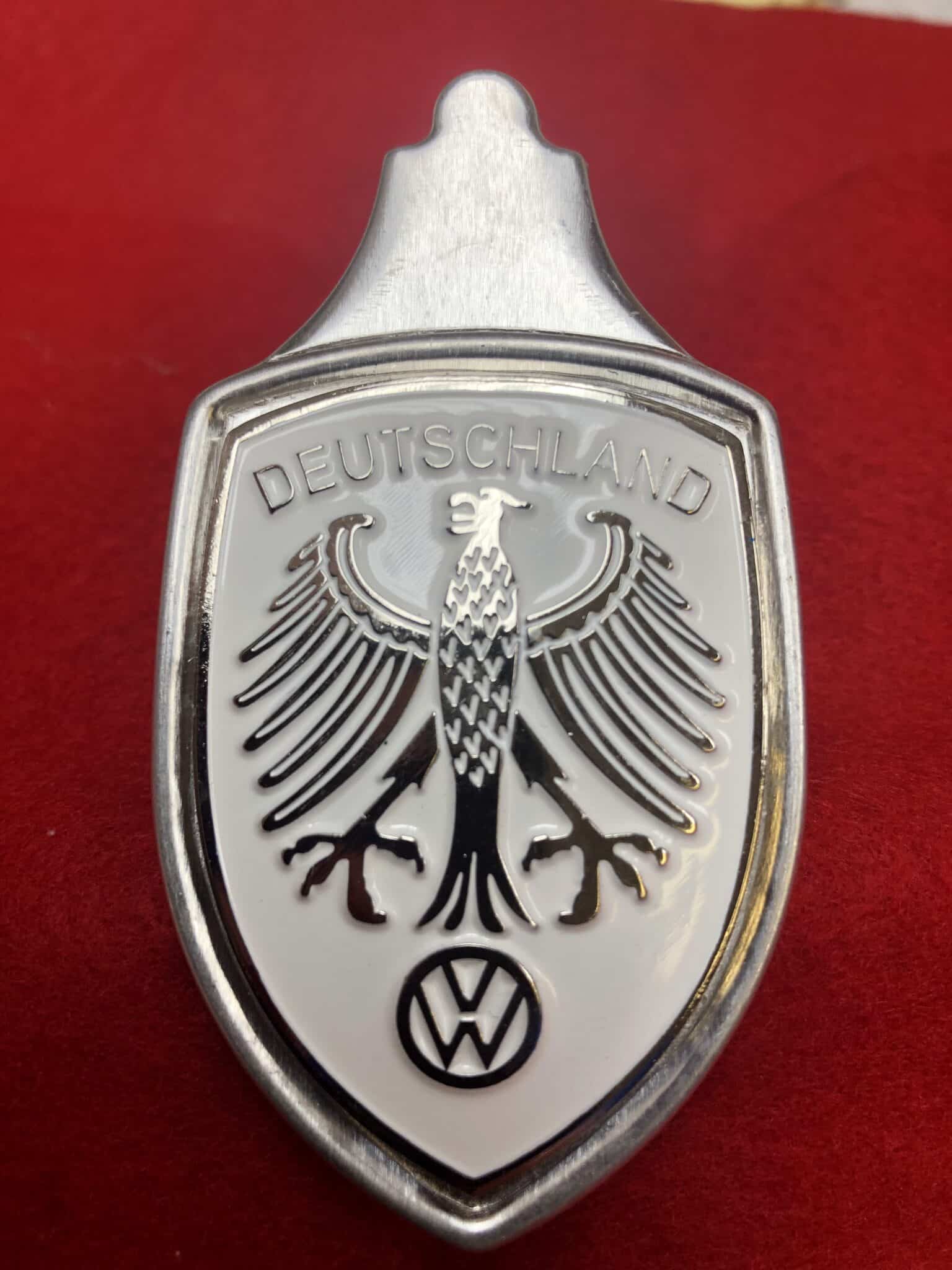 Volkswagen VW German Deutschland Hood Badge Crest. Made from a cast alloy metal and then painted to bring out the details. Can be mounted on hood, grille or just about anywhere you like. Unit included mounting tabs for tight fit.